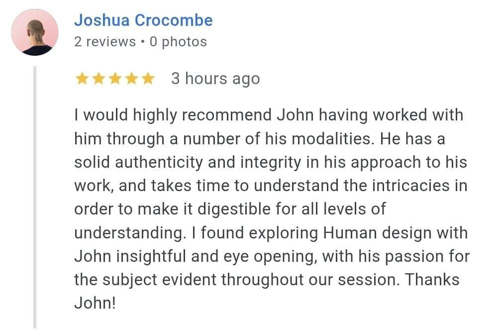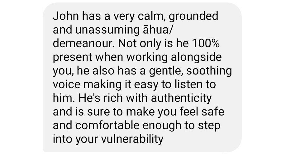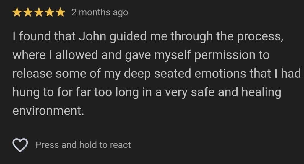 “I approached the session with an open mind as to what could happen but also had intentions of what I wanted out of the session. I was thoroughly impressed with how John held the space for me, I felt safe, held and loved which enabled me to dive deeper into my own vulnerability.”
