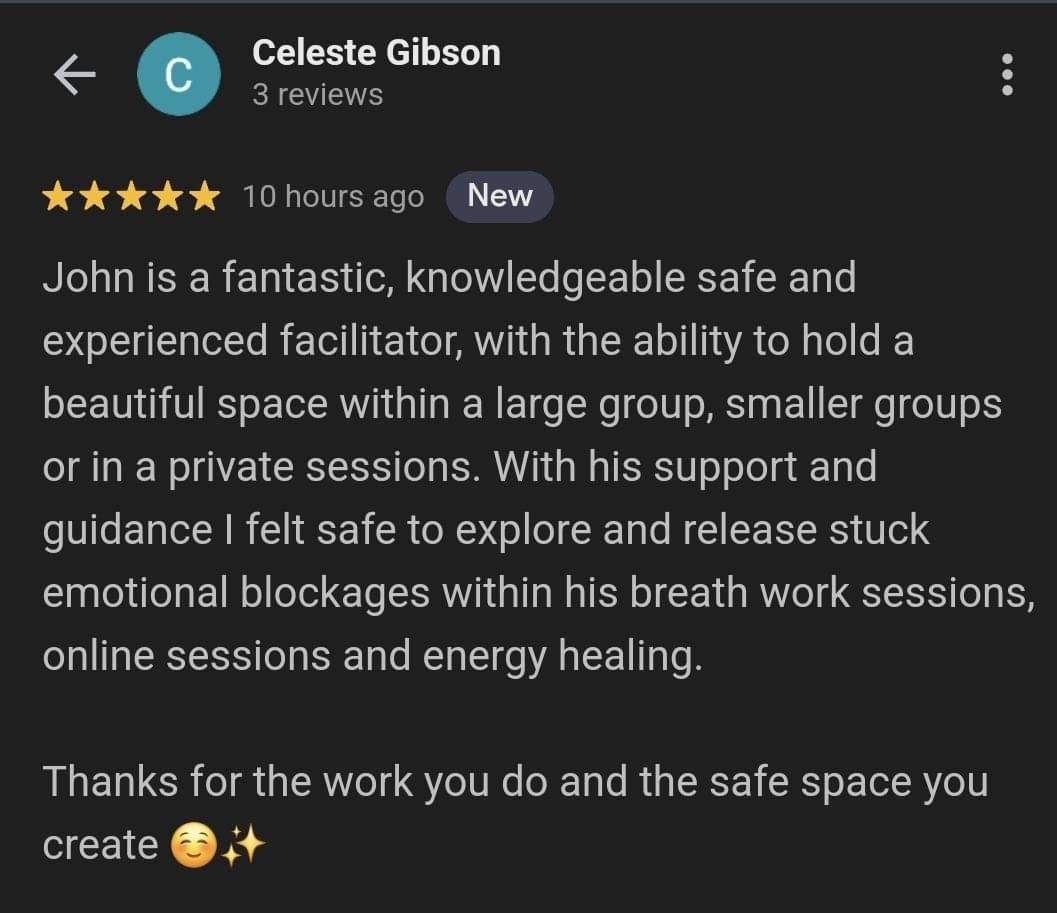 “John was very warm, welcoming and patient which made all the difference. He gently guided me through a pretty life-changing breathing exercise I’ll never forget. Many emotions were stirred up which I struggled to show but he really helped me open up. It was a deeply spiritual experience. I also came away with some good tools to use in my daily life when I’m struggling with anxiety, remembering the breath is so very important. I’d highly recommend him to anyone looking to show up for themselves and dive deep.”