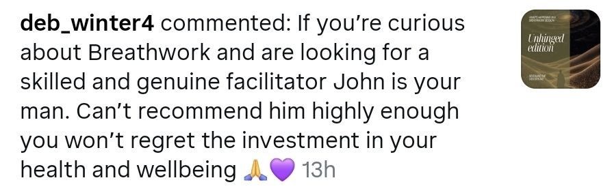 His ability to instil a sense of safety and security is remarkable, and he skillfully guides participants through the process with a delicate touch. In a time marked by heightened vulnerability, having someone who offers unwavering support without imposing pressure or being overwhelming is of paramount importance. John effortlessly excels in this regard, and his adept facilitation ensures a sense of emotional stability and guidance throughout the breathwork journey. His expertise in holding space for individuals during their unique emotional experiences is truly commendable, making him an invaluable asset in the realm of breathwork and mindfulness practices."